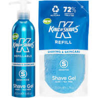 King of Shaves Refillable Sensitive Shave Gel with Aloe & Tea Tree is dermatologically tested, vegan and vegetarian friendly, made in Britain and can also be used as an effective pre-shave wash or beard shampoo.